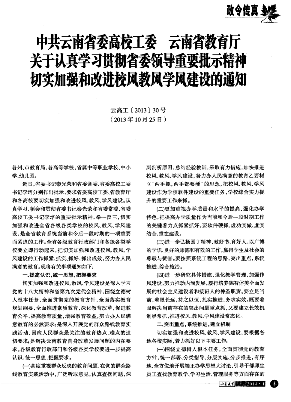 省委高校工委、省教育厅关于切实加强和改进校风教风学风建设的通知